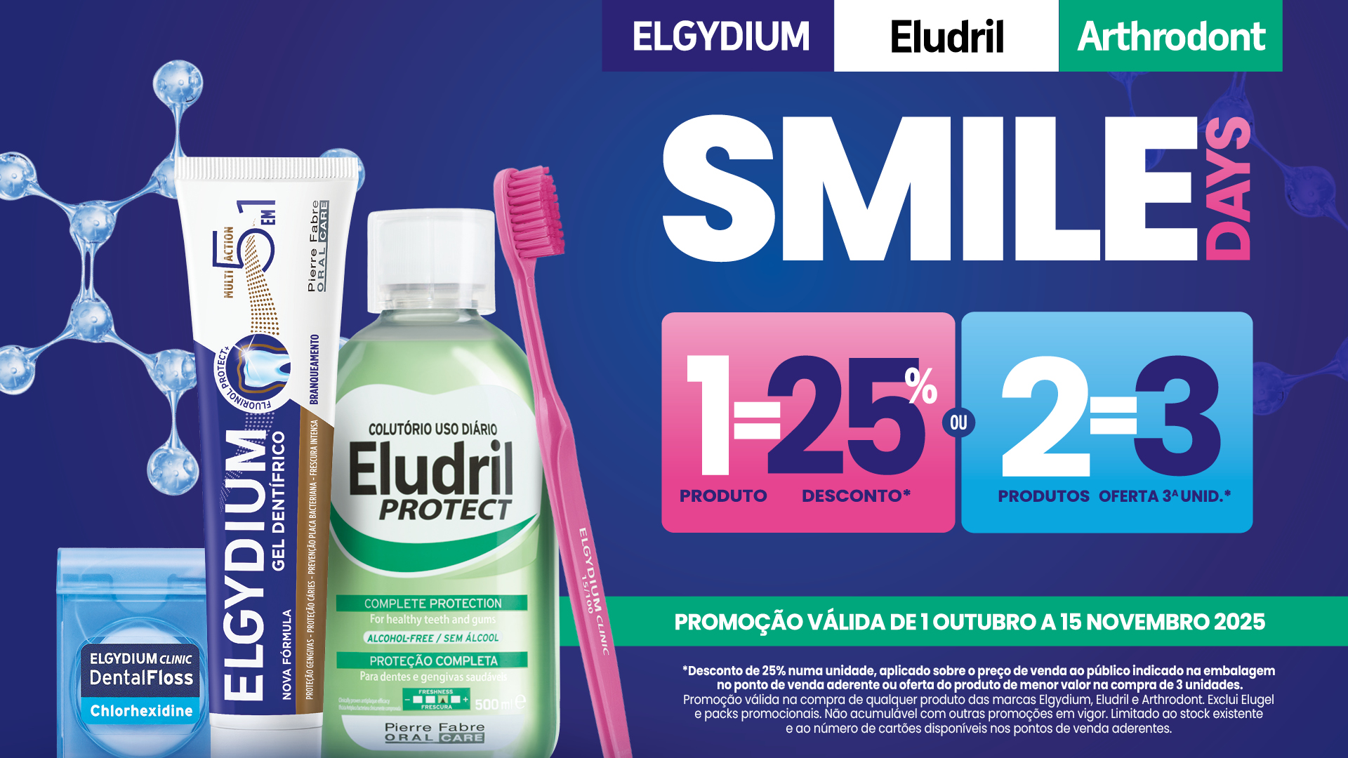 Invista na sua saúde oral com Elgydium, Eludril e Arthrodont, agora com condições especiais: